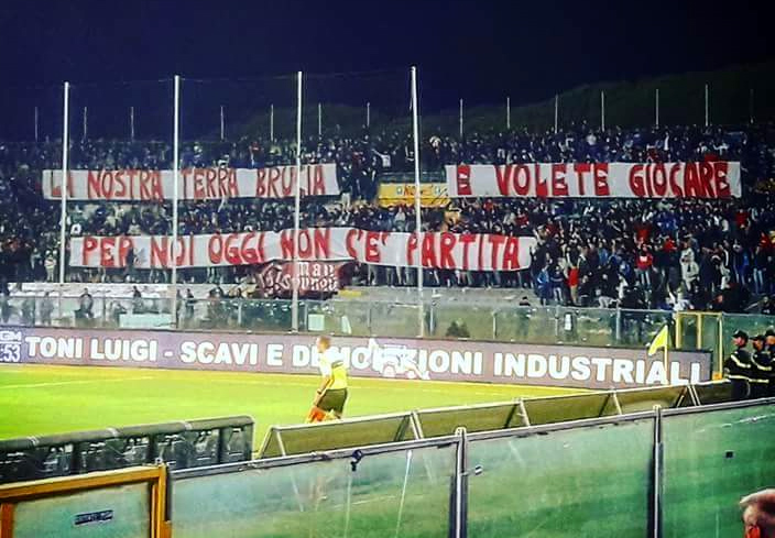 Il Monte Serra era in fiamme da poche ore ma la partita allo stadio di Pisa si è giocata. Il 25 settembre scorso, nonostante la società pisana avesse chiesto il rinvio al giorno successivo del derby con l’Arezzo, di fronte al diniego della Lega Pro, com’è noto, non è stato ritenuto opportuno adottare provvedimenti impeditivi allo svolgimento della gara. Il fatto, tra le altre cose, suscitò polemiche e l’indignazione degli stessi tifosi pisani che affollavano la curva Nord, manifestata con l’abbandono degli spalti dopo 15 minuti dal fischio d’inizio e l’esposizione di uno striscione con la scritta “La nostra terra brucia e volete giocare, per noi oggi non c’è partita”.
